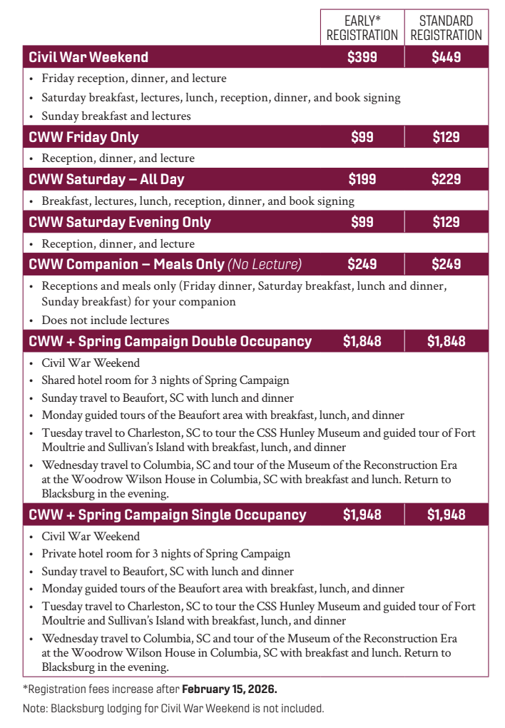 We look forward to welcoming you to Blacksburg from March 27-29, 2026 for Virginia Tech’s annual Civil War Weekend. Registration is open now!